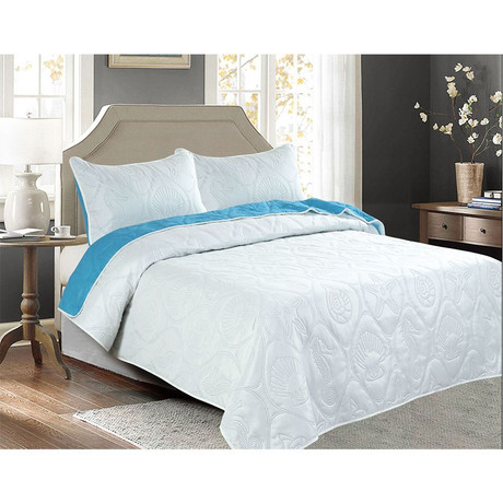 3 PC Shell & Seahorse Stitched Pinsonic Reversible Oversized Bedspread Blue Color